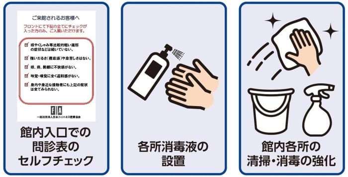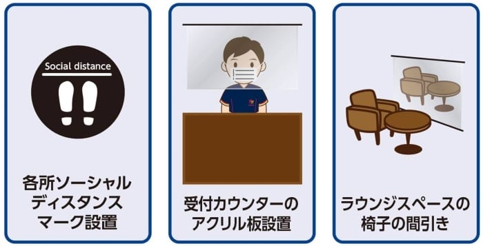 営業再開にあたり、皆様に安心してご利用いただけるよう、以下の取組を徹底していくとともに、感染拡大防止のために、消毒や定員の制限等、ご協力を賜りますようお願いいたします。