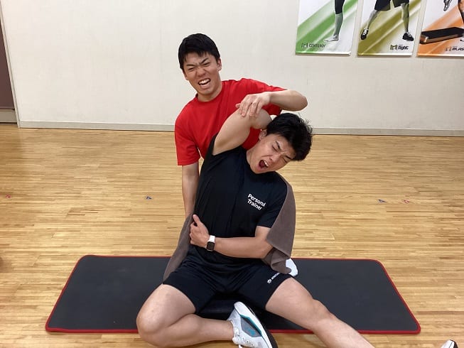 全身をほぐしてもらった後は、トレーナーによるストレッチパート。