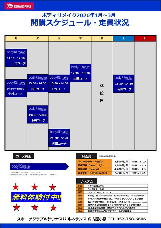 body REmake GroupTraining 2026年1月~3月スクールカレンダー
