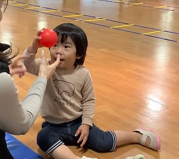 お顔を動かさずに、目だけを動かし、視野・物を追いかける力をつけます。