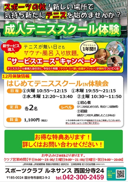 【成人テニススクール】テニススクール体験情報!12月入会、体験随時受付中!ジムや温浴施設も使えるのはルネサンスだけ!