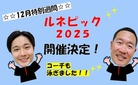 こんにちは!スイミングコーチの藤井です。12月の特別週間では、ルネピックの開催が決まりました!今年も、日ごろの練習の成果を発揮できる絶好のチャンスです! 今回は、級ごとに次の種目に挑戦します。1・・・・