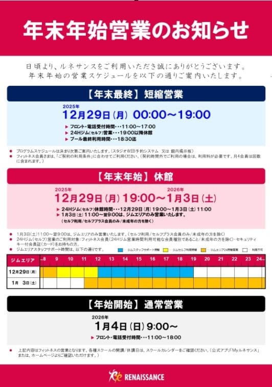 1/3(土)は11:00~ジムエリアのみ利用可能となっています。