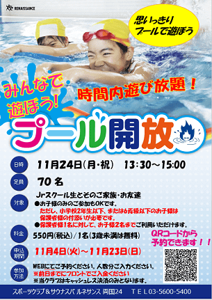 11月24日(月・祝)プール開放を実施いたします!