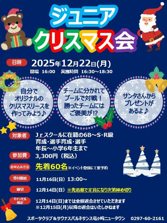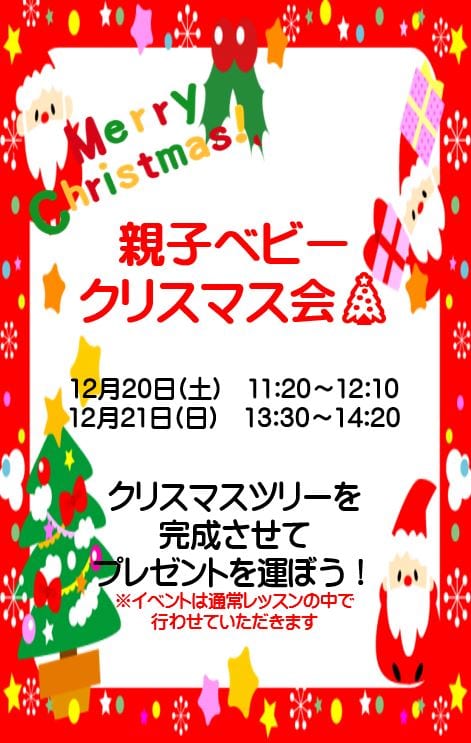 今回はジュニアスイミング、親子ベビーにてクリスマス会を行います。