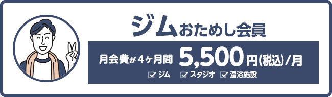 ●おためし会員は最長4ヶ月、ご入会時に選択いただける会員プランで、8ヶ月以上ご在籍の方に限ります。●おためし会員期間終了後は、ご入会時に選択された会員種別に変更となります。(後からの種別変更可)●入会時に、初期費用(入会金・事務手数料)が必要です。●24hジム導入店舗のジムエリアは、24時間ご利用できます。(休館時間・未成年を除く)●プールエリアはスクール実施中など利用できない場合もございます。●夫婦でおためし会員は、入会「事前WEB登録」の際、各々で登録し、同じ来館日時にてご予約ください。