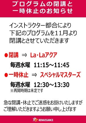 【プールエリアプログラムの閉講と一時休止のお知らせ】