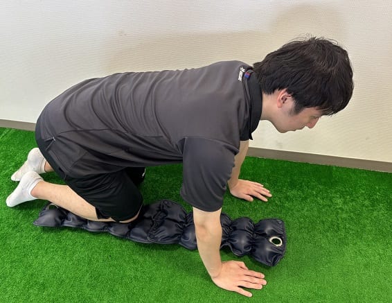 「キューフィッターPro」という2列に並んだボールが入ったアイテムを使い、日常生活でこわばりやすい部位をやさしくほぐしていきます。転がしたり揺らしたりすることで、心地よい刺激がカラダ全体に広がり、リラックスしながら筋肉の緊張をゆるめていきます。肩、腰まわり、脚や足裏など、スマホやパソコン、デスクワークなどで負担がかかりやすい部位を中心にセルフマッサージを行います。力加減や姿勢は調整できるため、初めての方でも安心してご参加いただけます。