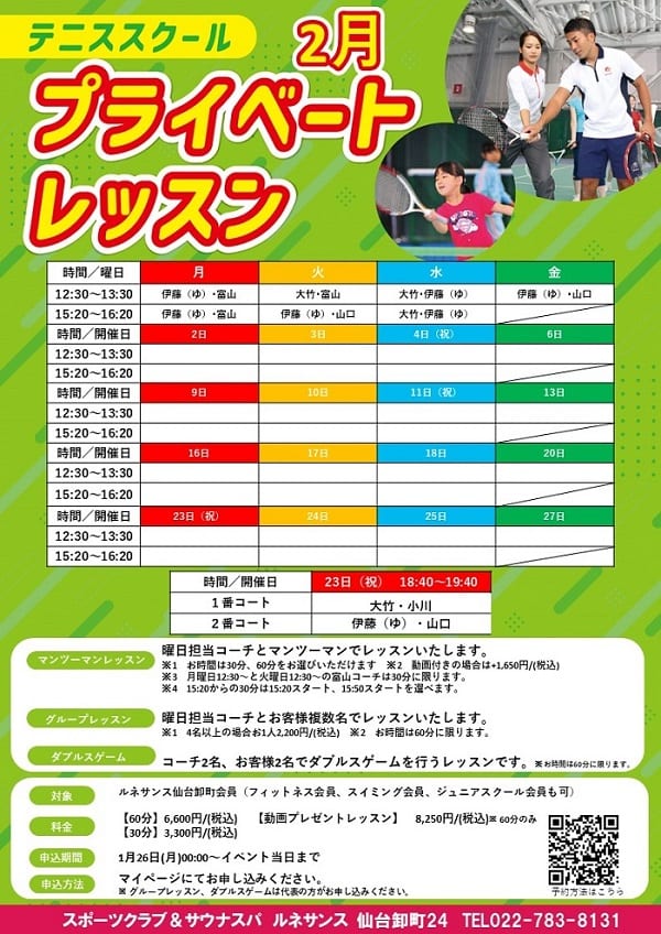 【2月15日更新テニス会員様向け】毎月大好評!テニス特別レッスンの最新情報や空き状況の確認はこちら♪