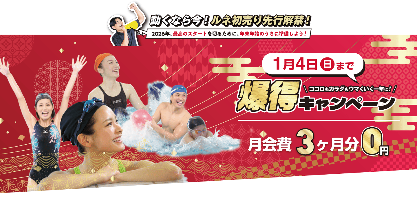 ●おためし会員は最長4ヶ月、ご入会時に選択いただける会員プランで、8ヶ月以上ご在籍の方に限ります。●おためし会員期間終了後は、ご入会時に選択された会員種別に変更となります。(後からの種別変更可)●入会時に、初期費用(入会金・事務手数料)が必要です。●プールエリアはスクール実施中など利用できない場合もございます。●ふたりでおためし会員は、入会「事前WEB登録」の際、各々で登録し、同じ来館日時にてご予約ください。