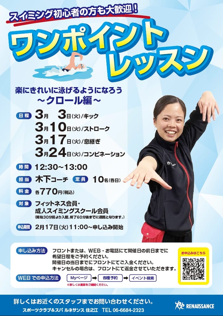 こんにちは!スイミングの木下です! いつもレッスンへのご参加ありがとうございます♪ 今回、成人スイミング会員さま・フィットネス会員さま向けにクロールのワンポイントレッスンを開催します! 「クロー・・・・