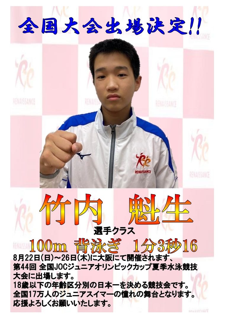 第44回全国JOC全国ジュニアオリンピックカップ夏季水泳競技大会に出場いたします。