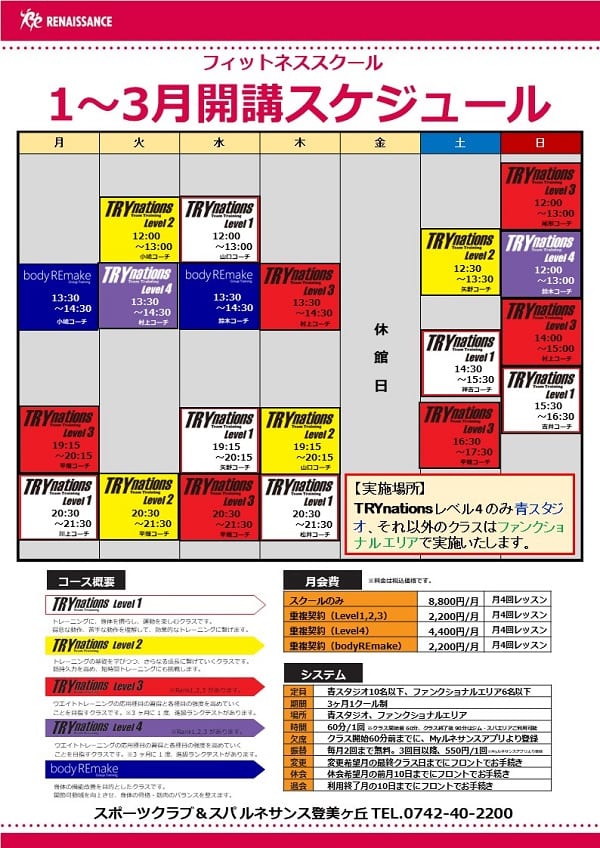 フィットネススクールの1~3月度の新スケジュールをご案内いたします。