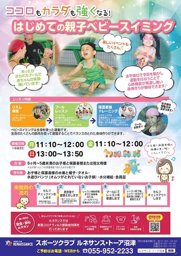 今回は6ヶ月から通える「親子ベビースイミング」についてお知らせします。
